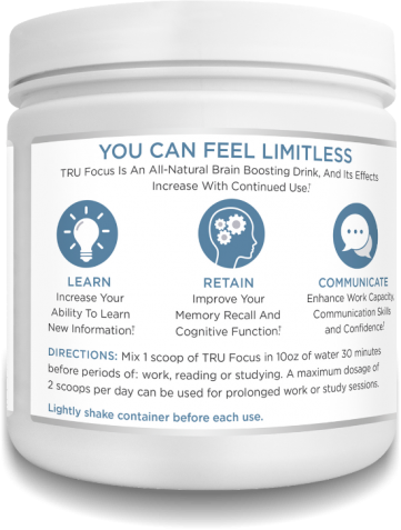 TRU Focus can be taken daily or as needed. There are impressive benefits that have been found through using the active ingredients consistently. Studies on the ingredient Alpha GPC have shown improvement over time in cognition and even restoring mental capabilities. In another study on the ingredient Vinpocetine, the results showed significant improvement in memory and concentration.